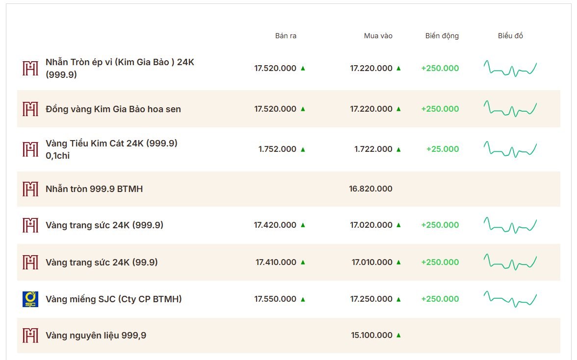 Tại Bảo Tín Mạnh Hải, giá mua vào vàng miếng được niêm yết 172,5 triệu đồng/lượng, trong khi bán ra là 175,5 triệu đồng/lượng. Giá vàng nhẫn trơn áp dụng 172,2 – 175,2 triệu đồng/lượng.