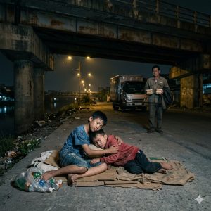 Dưới vòm sắt đen kịt, lạnh lẽo của cây cầu cũ kỹ bắc ngang con kênh tù đọng, hai sinh linh bé nhỏ nằm co ro giữa những tấm carton ẩm mốc. Đêm ở đây chưa bao giờ ấm áp. Gió thành phố luồn qua từng kẽ hở han gỉ của thành cầu, rít lên từng hồi như tiếng than vãn, rồi len lỏi vào từng mảnh áo quần rách nát của hai anh em.